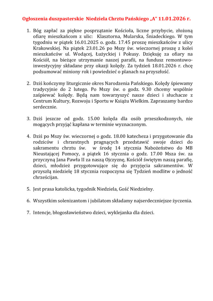 20 I 2026 godz. 7.00 – od sąsiadów: Józefa Kubraka, rodziny Misiów i Szyńców