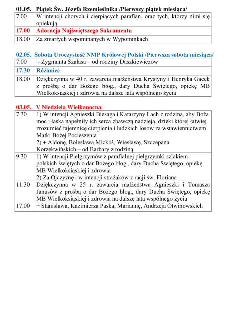 | Od rodziny Gromniak z Krakowa | 29 V 2026 godz. 18.00 | |